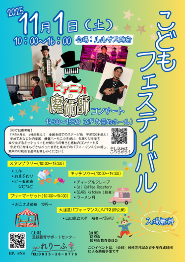 県内のこどもたちに、様々な人との交流や体験を通して楽しんでもらいたいという思いから、『ピアニカの魔術師』さんによるコンサートや、スタンプラリー形式のワークショップ、フリーマーケットなどを開催します。